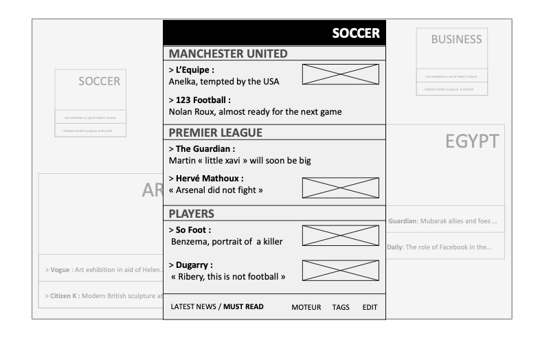 Une première étape consiste à travailler sous forme de story-boarding. Cette phase permet d’identifier les écrans nécessaires au projet, leur enchaînement, ainsi que les grands blocs fonctionnels qui les composent (navigation, zones de contenu, modules spécifiques, interactions clés).